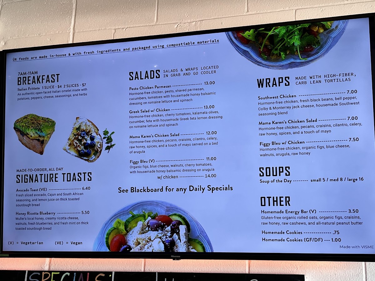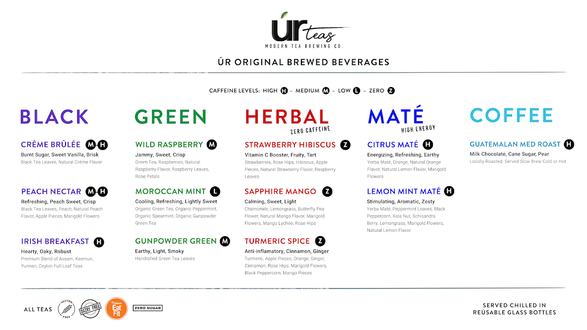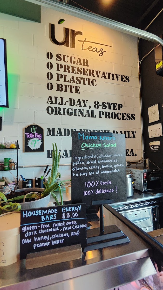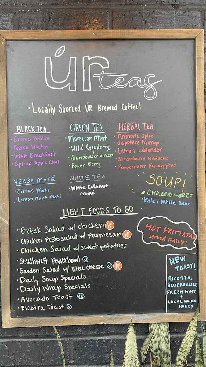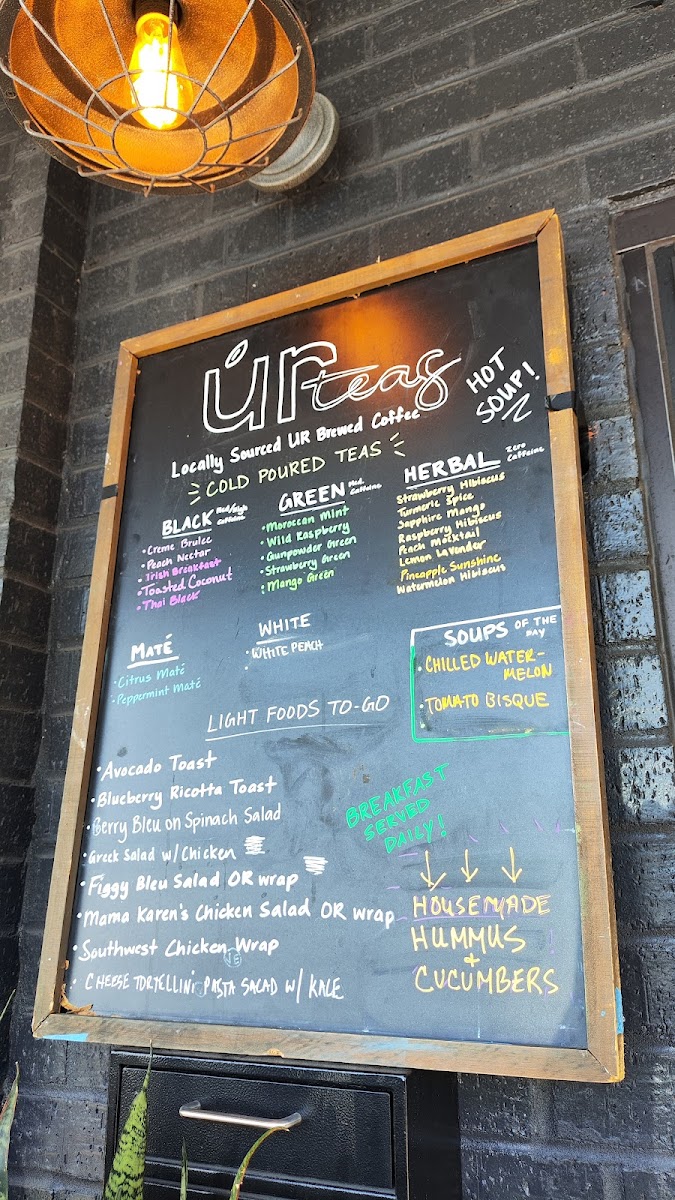 From a reviewer’s perspective, the menu at Ur Teas: Modern Tea Brewing Co. feels thoughtfully curated, balancing light bites with a strong focus on specialty teas. The breakfast offering, especially the Italian Frittata, sets a comforting tone, while the signature toasts like Avocado Toast and Honey Ricotta Blueberry add a fresh, modern touch. Heartier options such as the Southwest Chicken, Mama Karen's Chicken Salad, and Figgy Bleu W/ Chicken wraps provide satisfying variety, complemented by lighter fare like the Soup Of The Day and snacks including Homemade Energy Bar and Homemade Cookies. The tea selection truly stands out, ranging from creative blends like Peppermint Maté, Mocha Maté, and Caramel Apple Green to classic profiles such as Crème Brûlée, Peach Nectar, and Irish Breakfast black teas, alongside green options like Moroccan Mint and herbal infusions like Turmeric Spice. For something more filling, dishes like Pesto Chicken Parmesan, Greek Salad W/ Chicken, and the Southwest Power Bowl Moroccan Couscous offer balanced, flavorful choices. Unique extras like the Toasted Belgian Waffle and Figgy Bleu further round out the menu. Although prices aren’t listed, the diversity and creativity of items-from teas to wraps and salads-leave the impression of a menu designed to cater to both casual tea lovers and those seeking a light yet satisfying meal.
